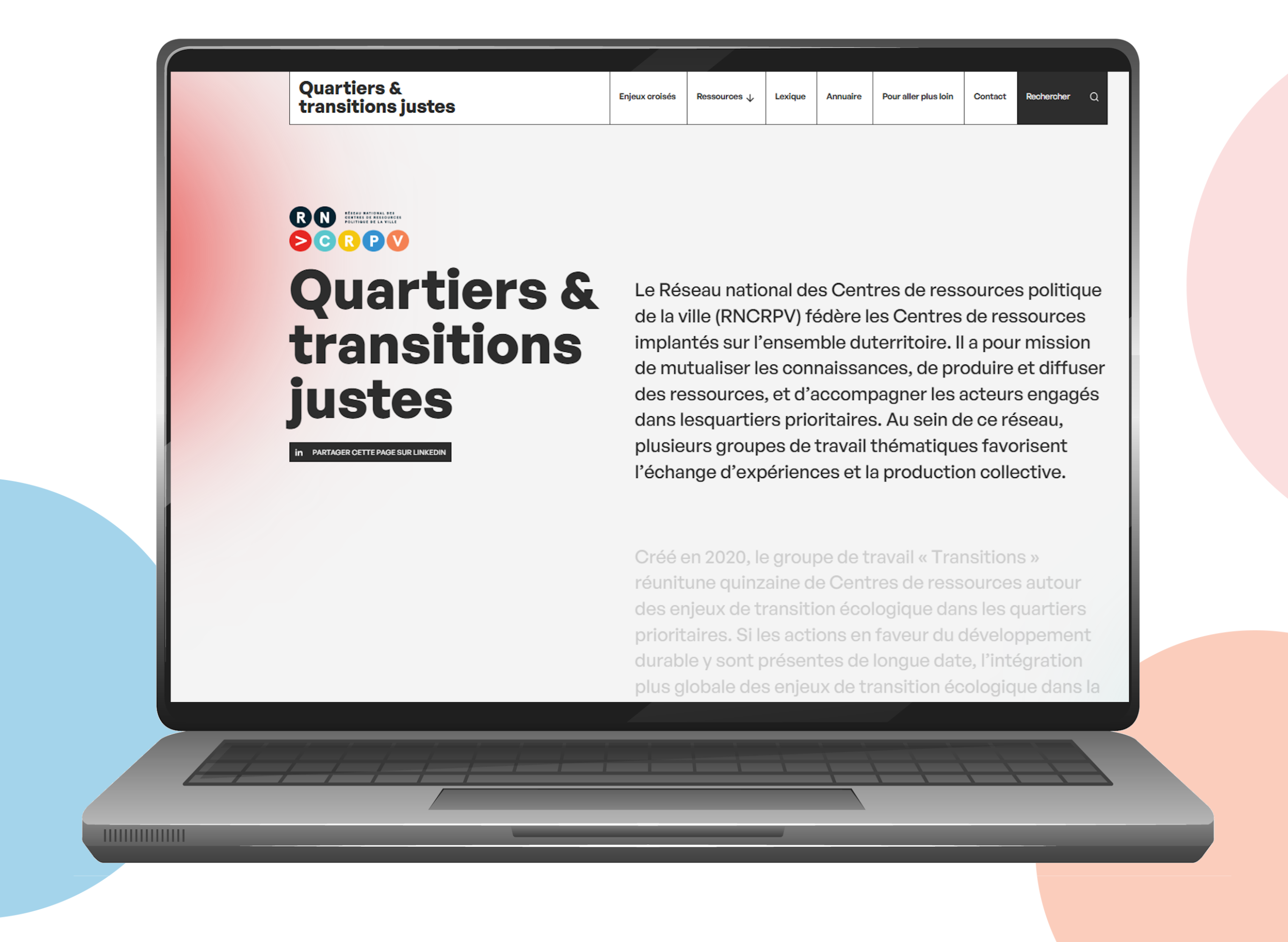 Au sein du Réseau National des Centres de Ressources Politique de la Ville, et depuis 2020, le groupe de travail « Transitions » réunit une quinzaine de Centres de ressources autour des enjeux de transition écologique au sein des quartiers prioritaires. Le site Quartiers et transitions justes reprend les différents éléments de capitalisation de ces dernières années pour offrir aux professionnels de l’Etat, des collectivités, des associations et aux citoyens, des outils pour que progresse la transition écologique dans les quartiers prioritaires de la ville.