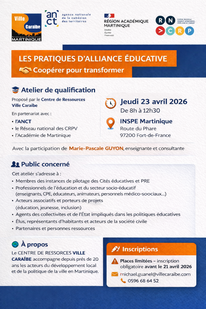 VILLE CARAÏBE, en collaboration avec l’ANCT, le RNCRPV (Réseau national des Centres de ressources Politique de la Ville) et l’Académie de Martinique, a le plaisir de vous convier à un atelier de travail et d’échanges consacré aux coopérations éducatives : « COOPÉRER POUR TRANSFORMER » Le jeudi 23 avril, de 8h00 à 12h30 A l’INSPE de l’Académie de […]